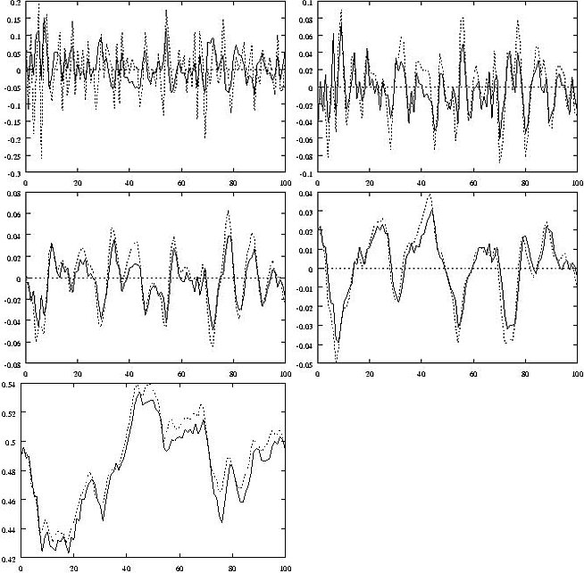 The superimpostion of scales and of fluctuations or cycles is potentially very valuable. It allows the underlying signal to be disentangled and some components to be more easily modeled and predicted compared to others. The following plots related to Web hits at one minute intervals. Shown are forecasts in the continuous line, and the original data in the dotted line. From upper left to bottom we have the first, second, third, fourth and residual scales. The forecasting method used here was an innovative dynamic recurrent connectionist method.