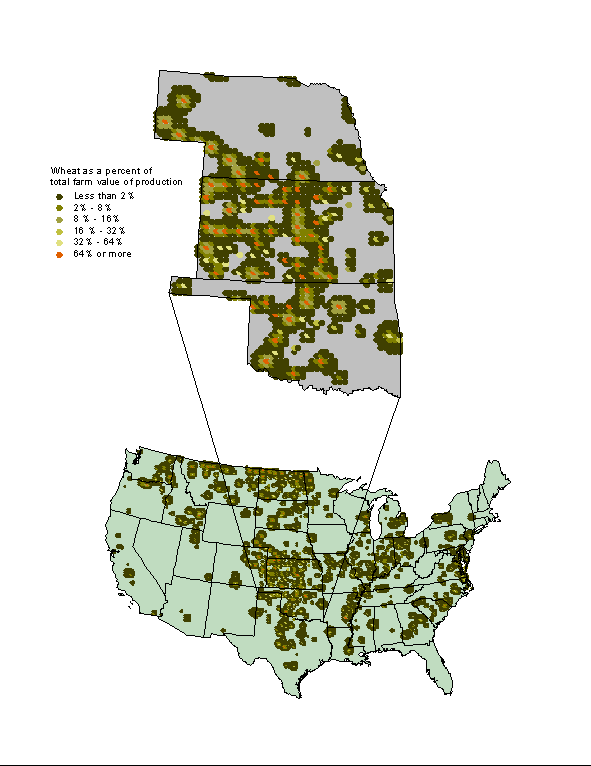 Result of wavelet regression, based on a heteroscedastic noise model, of 1995 wheat dependence data. Data from USDA. The noise modeling and filtering was carried out in MR/1 and IDL, followed by geo-referencing in ArcView.